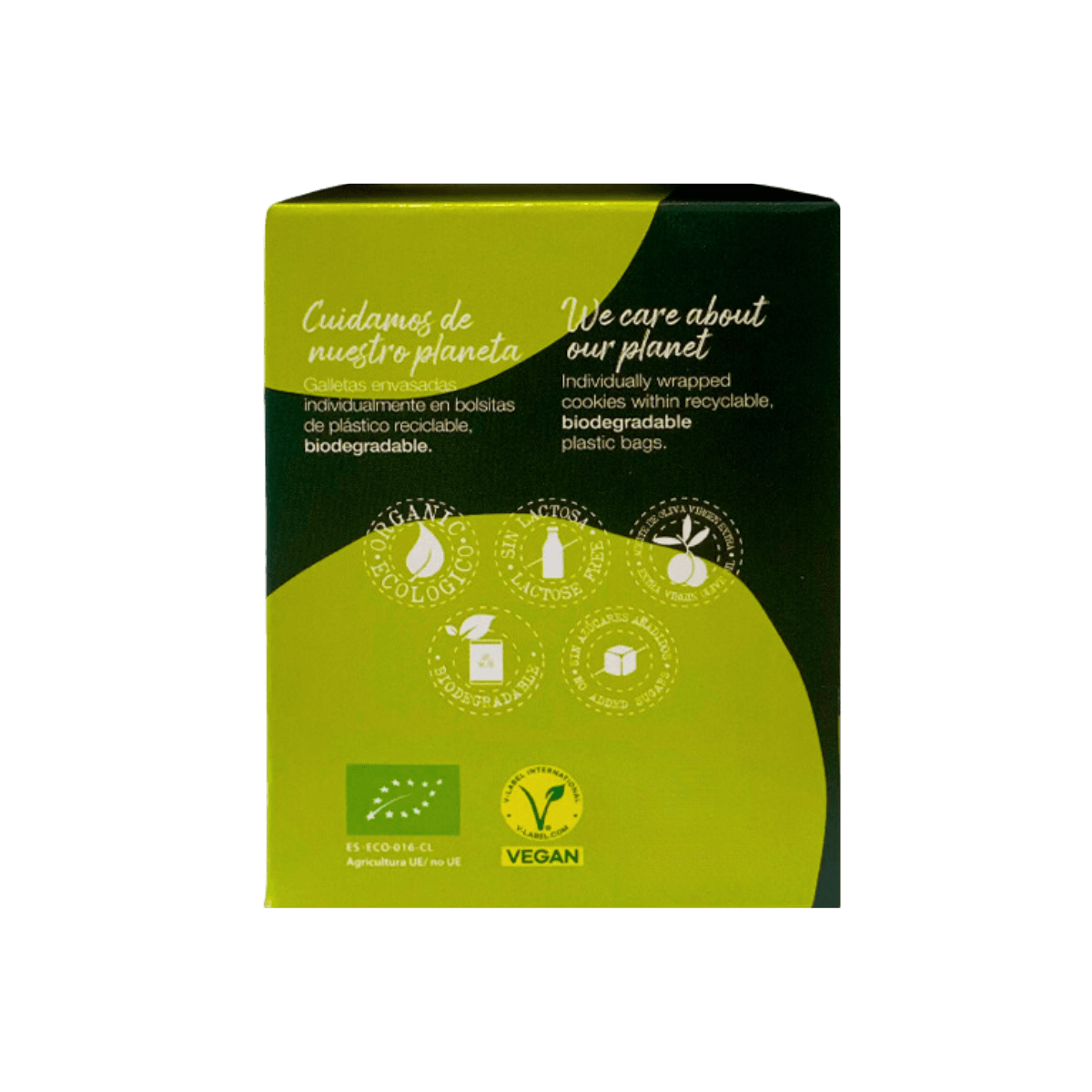 Deliciosas elaboraciones con certificado ecológico, aptas para veganos y celíacos elaboradas SIN GLUTEN. Galletas artesanas, preparadas con cariño para cuidar de ti, de los tuyos y del medio ambiente; empleamos aceite de oliva (grasas insaturadas) y rechazamos el uso de conservantes, colorantes, productos químicos de síntesis y de organismos genéticamente modificados. Alto contenido de fibra, sin lactosa, sin aceite de palma, sin conservantes, sin colorantes.